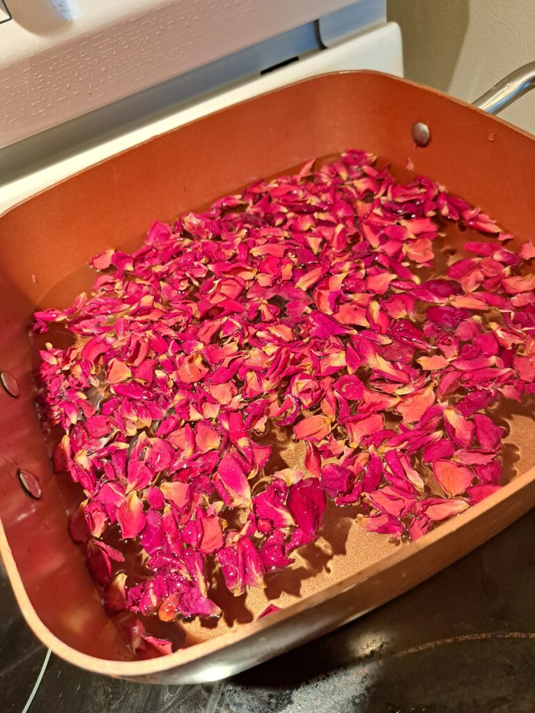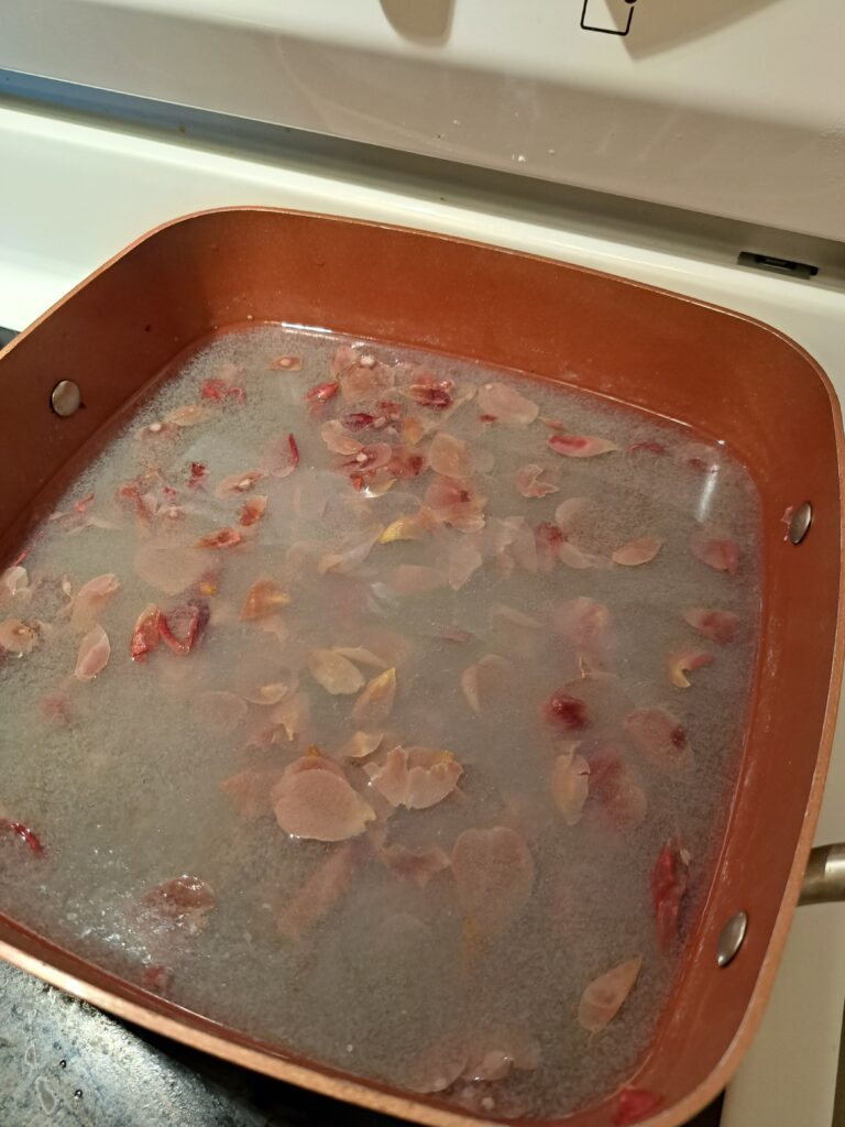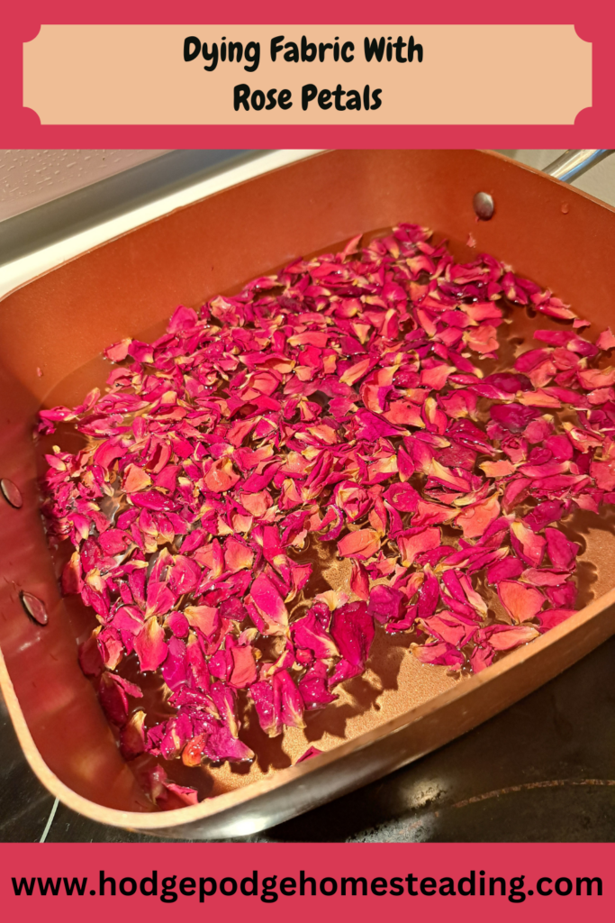 For me the first step was to extract the dye out of the rose petals. I put them in my dye pot and brought the water to a simmer.
