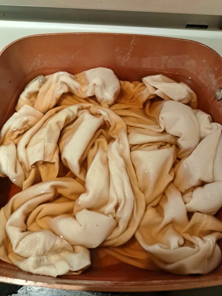 I let the fabric simmer of a low heat for awhile. Then I turned off the heat and let the fabric sit overnight. I did stir it a few times because my dye pot is quite small and not all of the fabric was submerged.