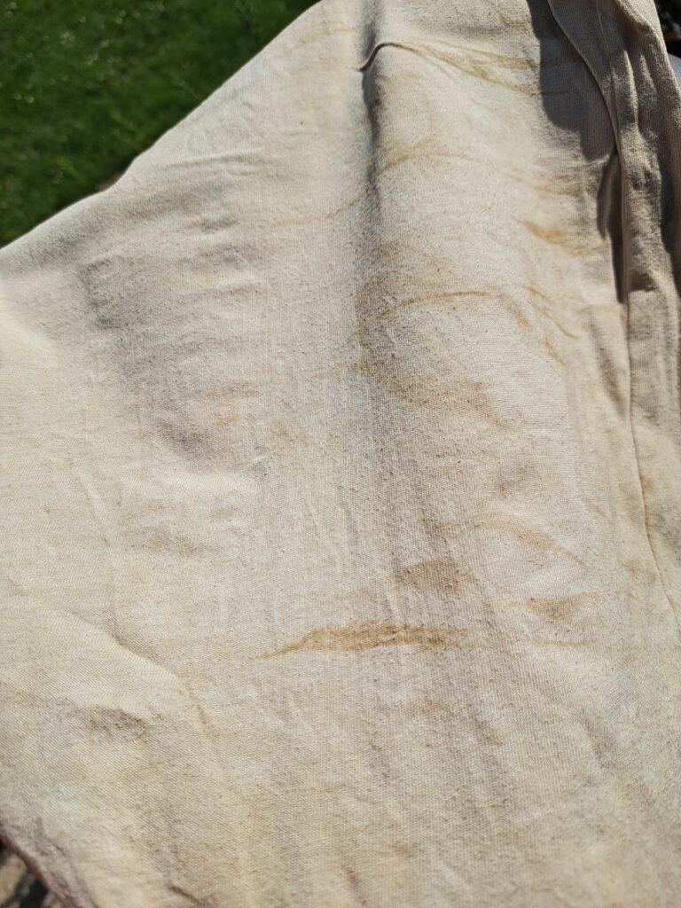 To start with, I selected something from my dying basket. (While I am still learning, I am using a collection of old white cotton t-shirts that I have pre-washed. The ones that look nice will end up in a future sewing project. The ones that don’t will have taken a short detour before becoming rags.) This means that I don’t have to start with selecting and laundering my fabric.