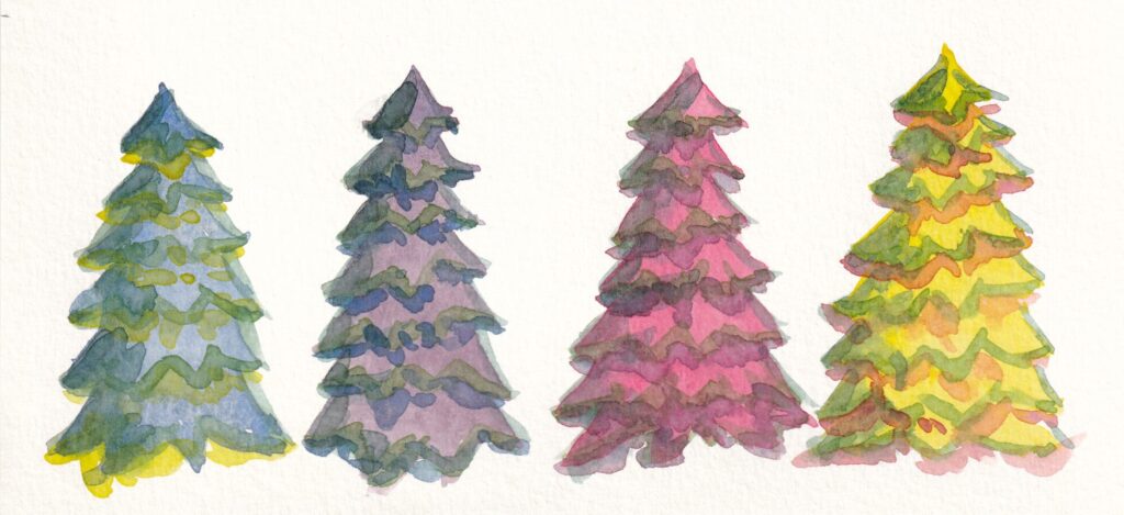Here are two versions of a Christmas card with evergreen trees. One a traditional green, the other more colourful. They are free for you to print and use. Once they are printed, cut off the extra paper at the line. Then fold them in half so that all of the trees are on one side of the paper (landscape). You will end up with a long, thin card that will fit nicely in a business size envelope. This keeps costs down as this size is readily available.