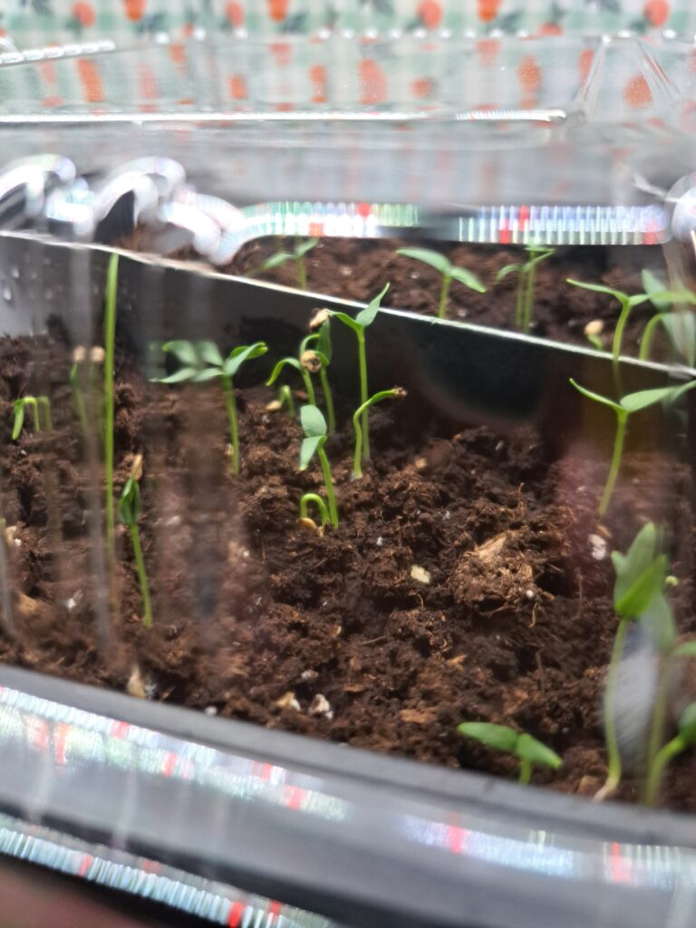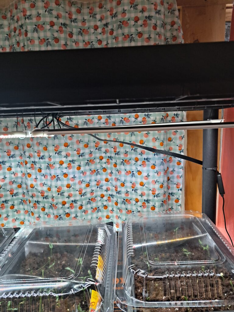 There’s nothing fancy about what they are growing in, just dollar store seed trays and cake pan lids at this point.
