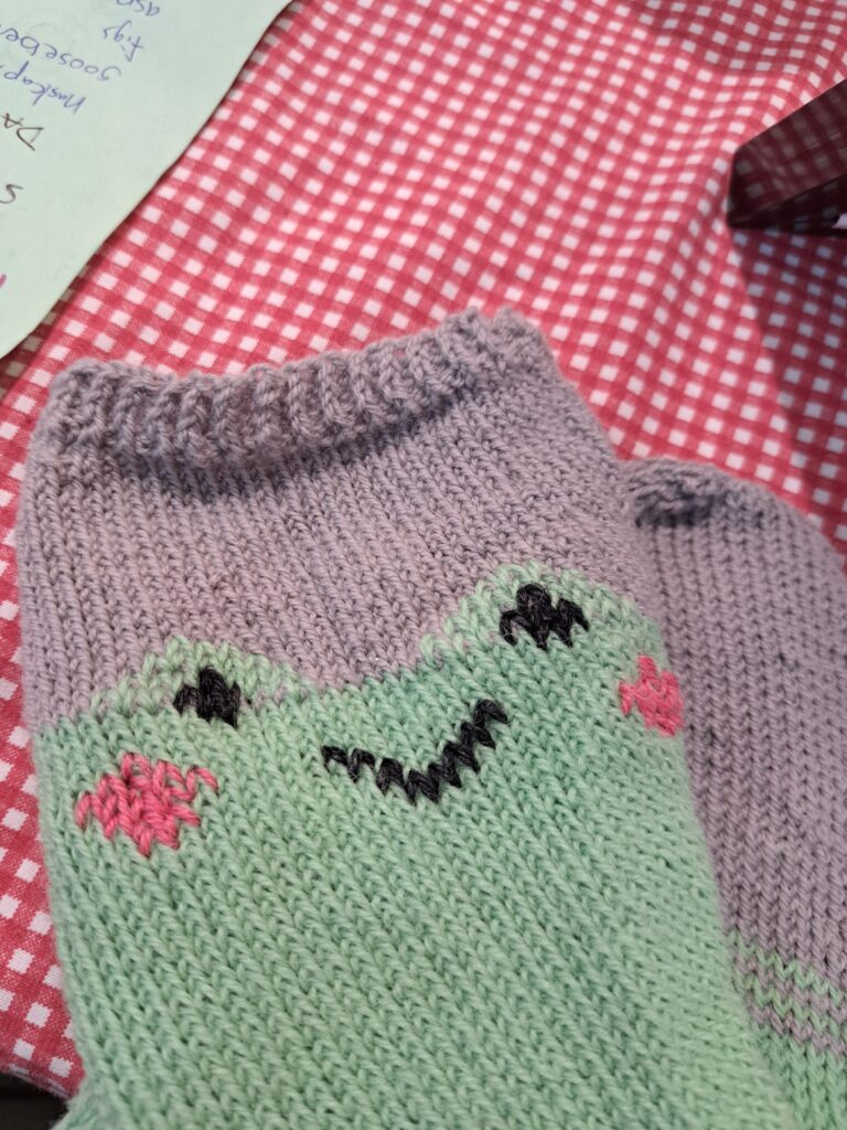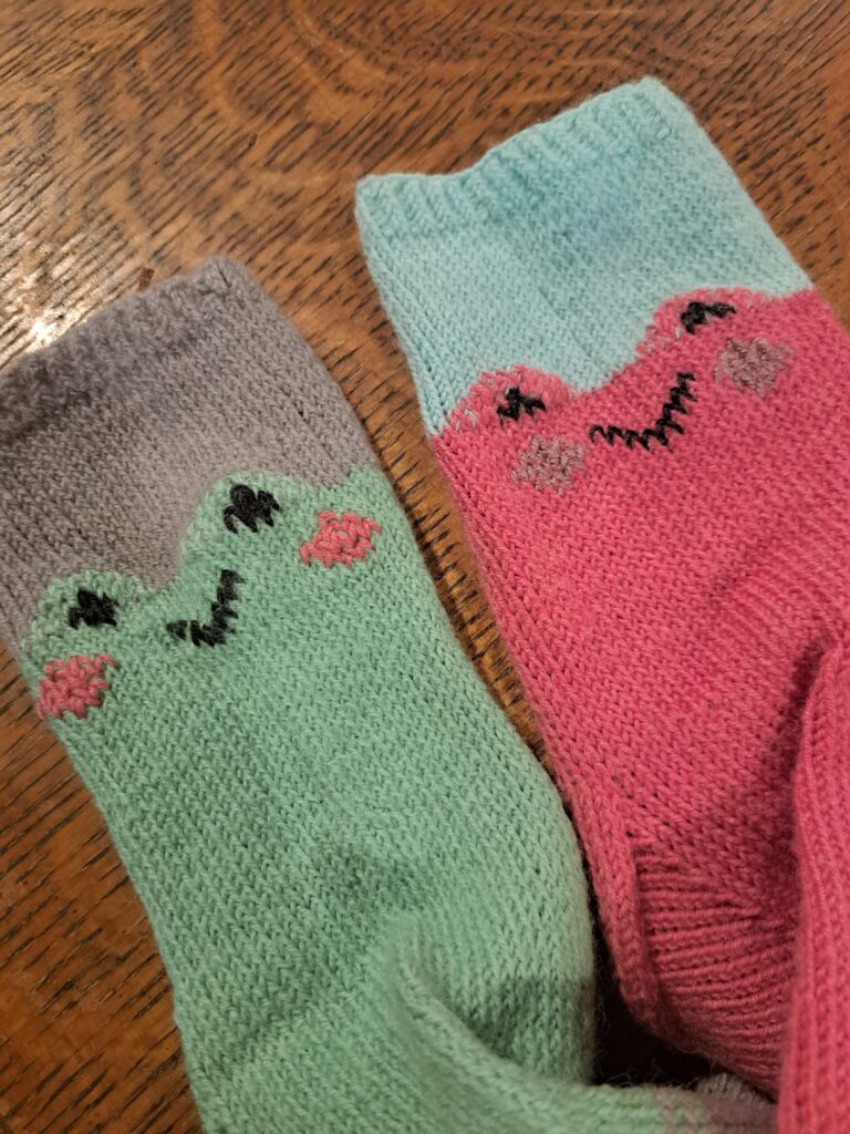 It’s very beginner friendly. You knit the colour blocked socks, then embroider the eyes and face on after.